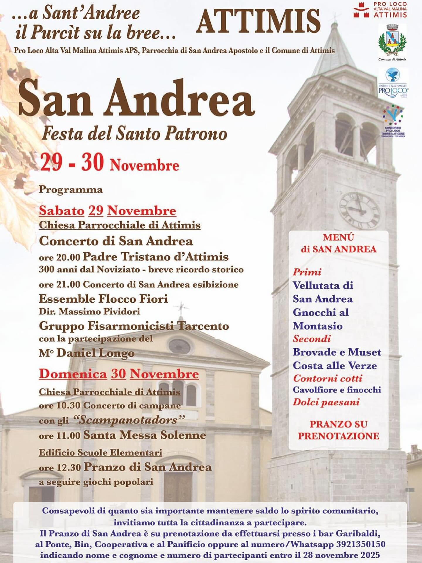 - Um 12:30 Uhr Andreas-Mittagessen im Gebäude der ehemaligen Grundschule von Attimis, anschließend Volksspiele