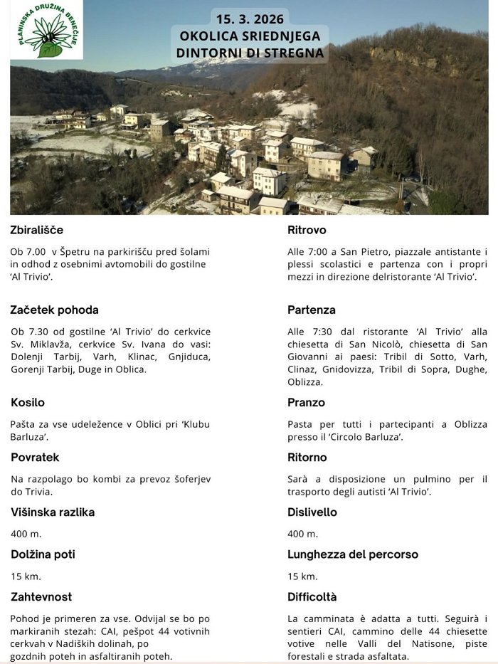 On Sunday, March 15, Planinska družina Benečije warmly invites you to join a walk in the surroundings of Stregna/Srednje.