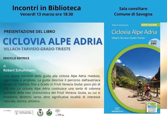 As part of the series of presentations “Meetings in the Library” in the municipalities of Savogna/Sovodnja and Stregna/Srednje, on Friday, March 13 at 6:30 PM, the presentation of the book “Ciclovia Alpe Adria” by Robert Schuhmann (published by Ediciclo) will take place in Savogna/Sovodnja.