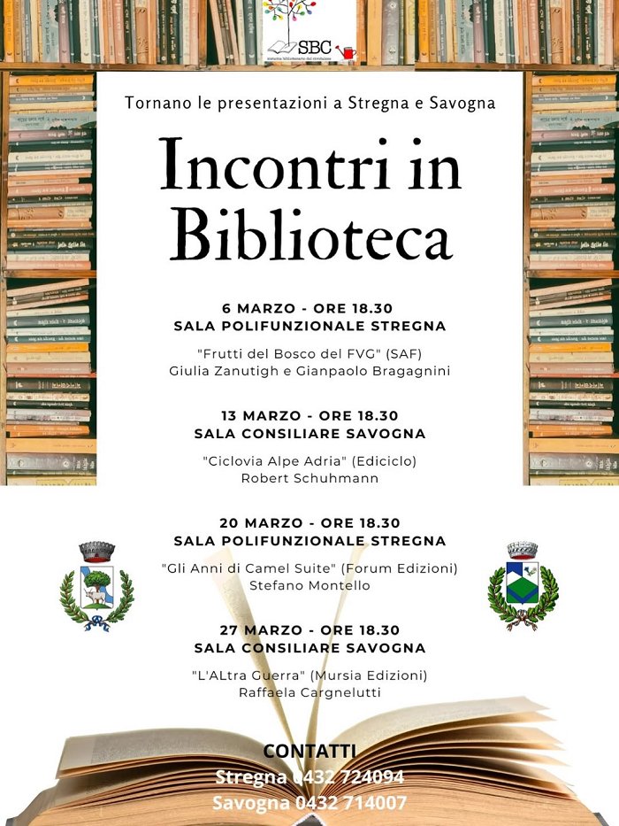 Organized by: Municipality of Stregna/Srednje, Municipality of Savogna/Sovodnja, Cividale Library Network (Sistema bibliotecario cividalese).