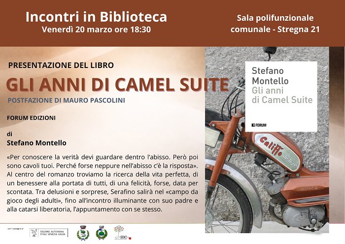 As part of the series of presentations “Meetings in the Library” in the municipalities of Savogna/Sovodnja and Stregna/Srednje, on Friday, March 20 at 6:30 PM, the presentation of the book “Gli anni di Camel Suite” (Die Jahre von Camel Suite) by Stefano Montello (published by Formu Edizioni) will take place in Stregna/Srednje.