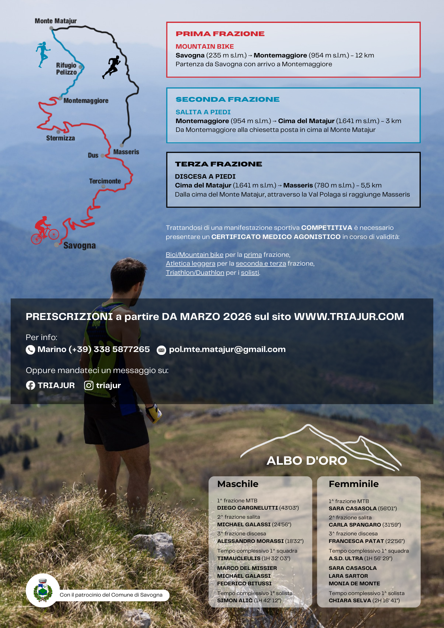Come ogni primo maggio, anche quest'anno la Polisportiva Monte Matajur, con l’aiuto di numerose associazioni volontarie del luogo, organizza la Triajur. Si tratta di una manifestazione sportiva competitiva composta da tre frazioni, ognuna delle quali è di competenza di uno dei tre frazionisti formanti la squadra. Ai più preparati fisicamente e psicologicamente è consentito sostenere l'intera competizione da soli.