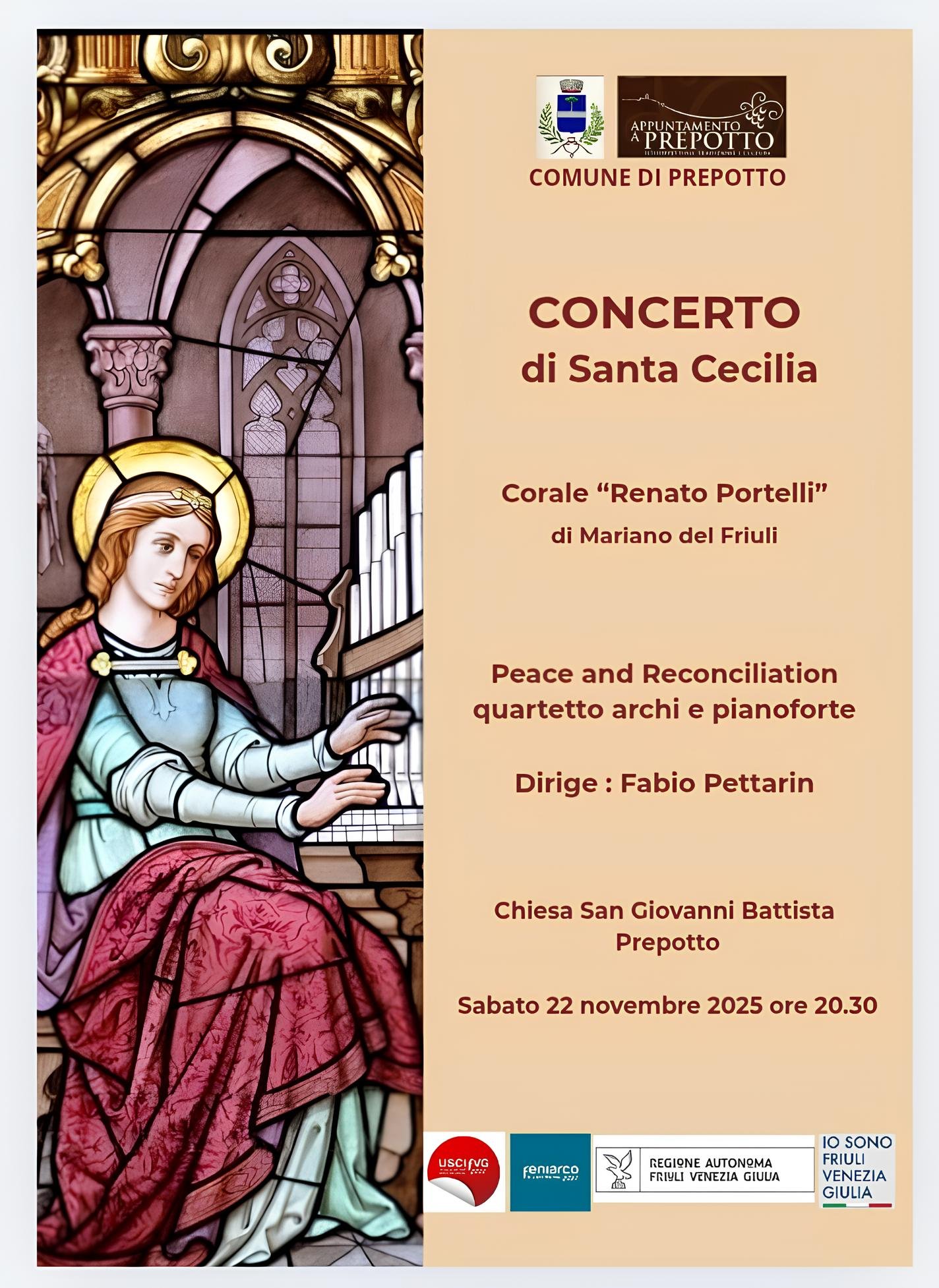 Sabato 22 novembre alle ore 20:30 terrà il concerto "Peace and Reconciliation (quartetto archi e pianoforte) con il corale "Renato Portelli" di Mariano del Friuli. Dirige Fabio Pettarin.