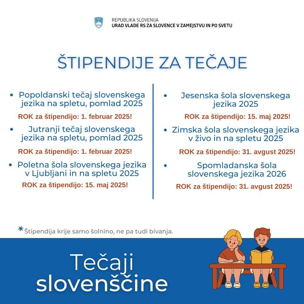 Anche quest'anno, l'Ufficio del Governo della Repubblica di Slovenia per gli sloveni d'oltreconfine (Urad Vlade RS za Slovence v zamejstvu in po svetu) assegna borse di studio per coprire le tasse scolastiche di alcuni corsi di lingua slovena.