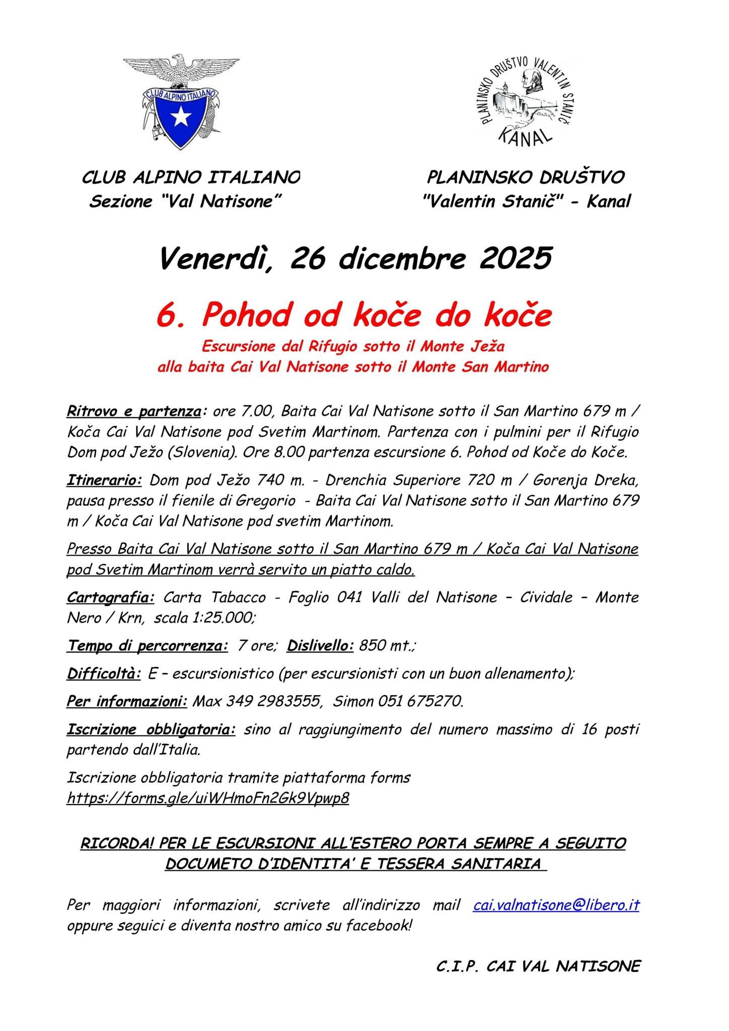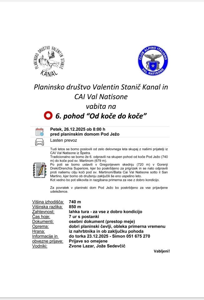 V petek, 26. decembra, bo potekal 6. pohod "od koče do koče", ki ga organizirata Planinsko društvo Valentin Stanič Kanal in CAI Val Natisone.