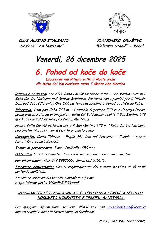 Tradicionalno se bomo odpravili na skupen pohod od koče Pod Ježo (740 m) do koče pod sv. Martinom (679 m). Po poti se bomo ustavili v Gregorijevem skednju (720 m) v Gorenji Dreki, kjer bo poskrbljeno za prigrizek in se nato odpravili proti našemu cilju koči pod sv. Martinom (Baita CAI Val Natisone sotto il San Martino), kjer bomo ob druženju zaključili še eno uspešno leto.