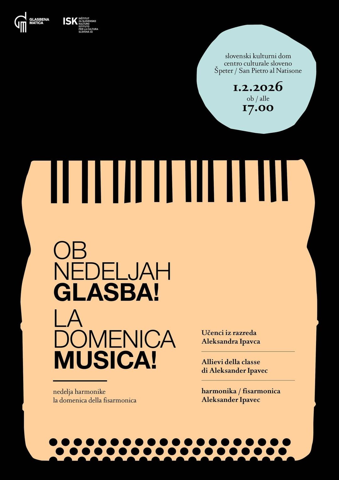 V nedeljo, 1. februarja 2026, bodo ob 17.00 v Slovenskem kulturnem domu v Špetru nastopili učenci razreda harmonike Aleksandra Ipavca.