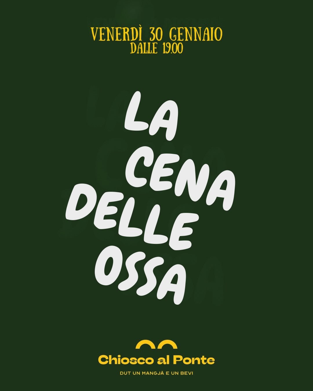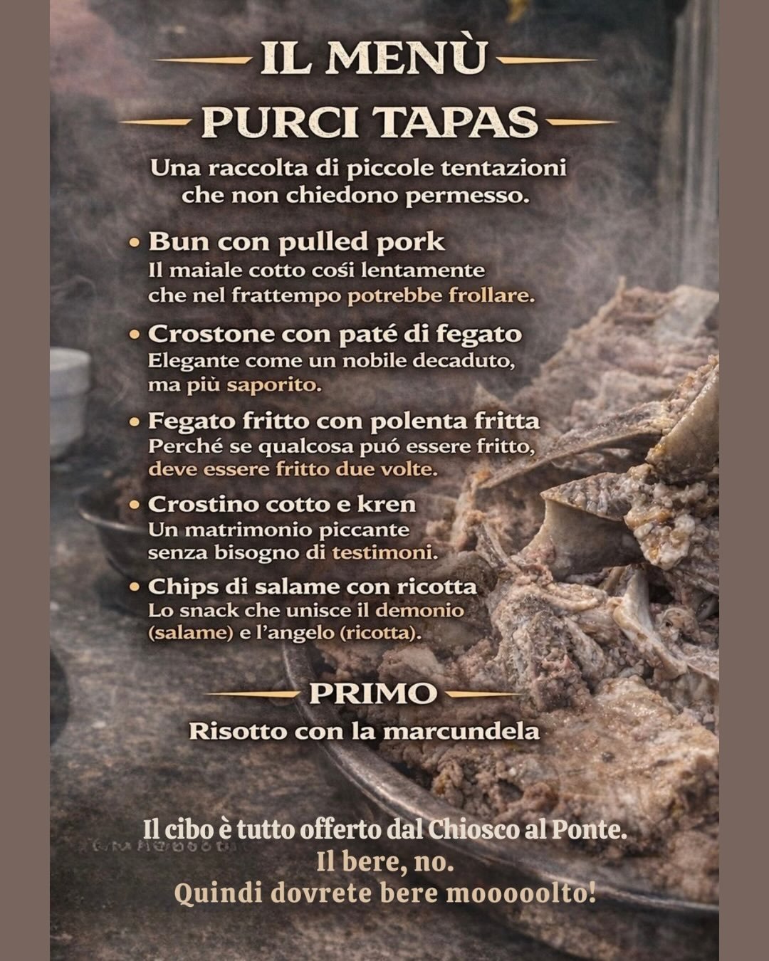 V petek, 30. januarja, vas v lokalu Chiosco al Ponte čaka meni s predjedmi in glavno jedjo na osnovi svinjskih kosti. Hrano časti hiša, vi boste plačali le pijače.