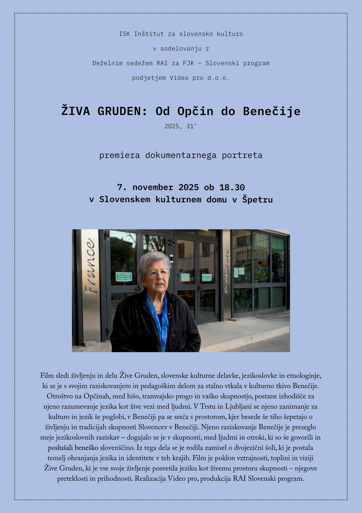 The film is a tribute to Živa Gruden’s perseverance, warmth, and vision, as she devoted her life to language as a living space of the community — of its past and its future. Produced by Video Pro and RAI – Slovenski program.