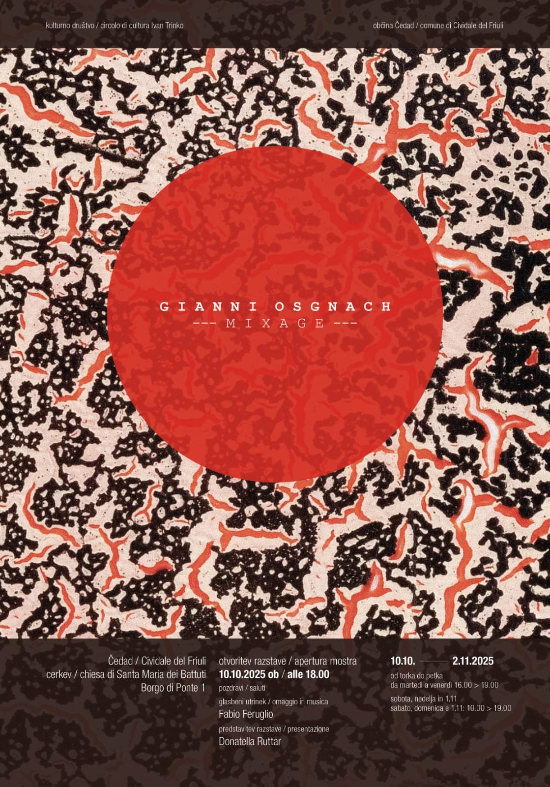On Friday, October 10, at 6 PM, the opening of the exhibition "Mixage" by the artist Gianni Osgnach will take place in Cividale del Friuli / Čedad. The exhibition will be open for viewing until Sunday, November 2, 2025, during the following opening hours: