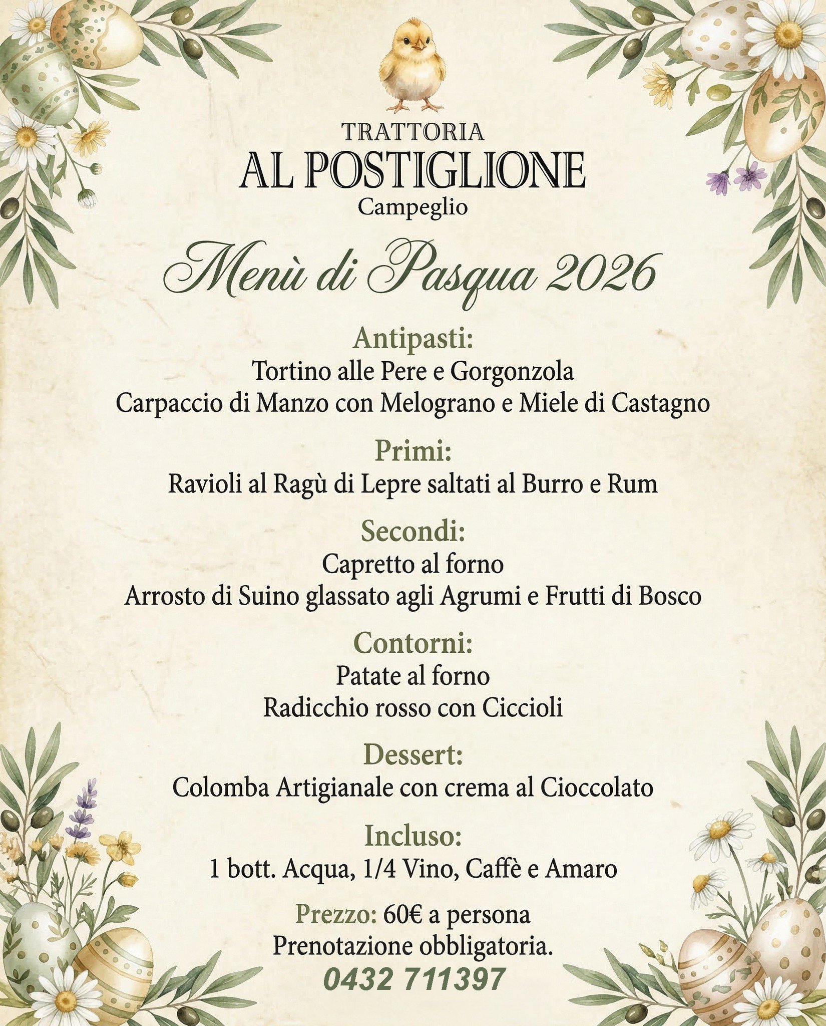 Domenica 5 aprile presso lil ristorante Al Postiglione dal 1938 a Campeglio vi aspetta un menù dedicato a 60 € a persona (incluso: bottiglia d'acqua, 1/4 di vino, caffè e amaro).
